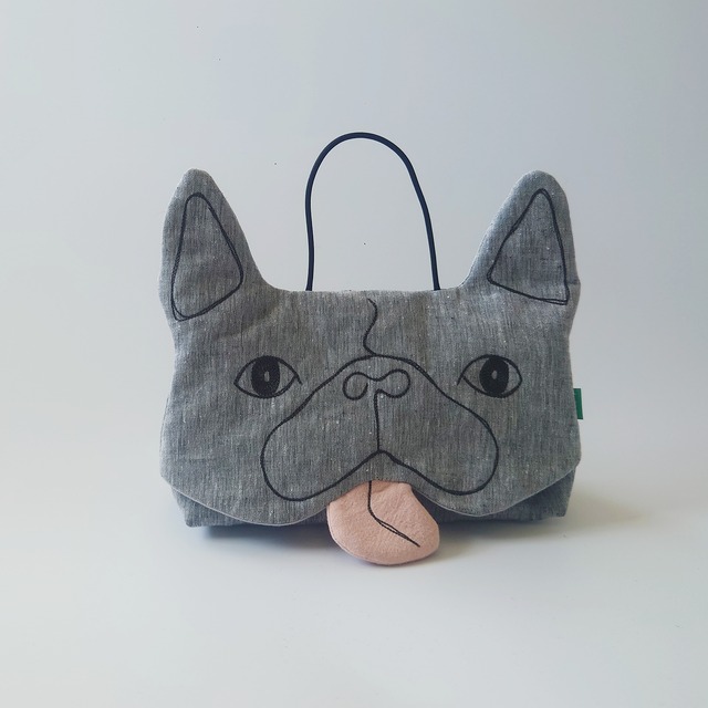 お耳リボンをむすぶとフレブルになるランチバッグです。 お顔やお耳はハンドルミシンで一つひとつ丁寧に刺繍しています。 表地はリネン、裏地にはオリジナルプリントのシーチングを使って仕立てています。 リネン地にキルト芯をつけているのでクタクタにならず、多少の保温効果があるようなないようなバッグです。 ランチタイムもずっとフレブルくんと一緒。 ジトっと見つめられながらの食事をお楽しみください。 ■素材 表地:リネン 裏地:コットン ■サイズ たて(耳のぞく):18cm よこ:30cm マチ:10cm お耳りぼん:たて24cm、幅9cm ※ハンドメイドなので個体差があります 刺しゅうはデリケートなのでやさしく手洗いしてください。 色の濃い生地の場合、最初は色落ちするかもしれないので、個別に洗ってください。
