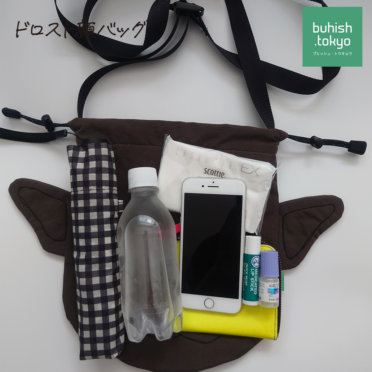 お財布とスマホ、ハンカチ、ティッシュのほか、小さなペットボトルや三つ折りの折りたたみ傘も入ります。